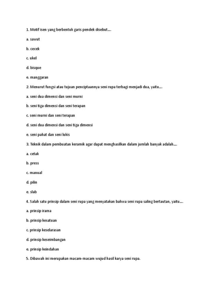 Seni tiga dimensi dan seni terapan c. Hai adik adik yang baik, pada kesempatan kali ini kakak ingin membagikan beberapa contoh soal yang mungkin dibutuhkan adik adik, soal kali ini adalah soal uts dari mata pelajaran seni budaya yang disusun untuk kelas xii sma/ma. Teknik dalam pembuatan keramik agar dapat menghasilkan dalam jumlah banyak adalah…. Di bagian dalam lingkaran tampak sebuah gambar bunga padma, yang konon diciptakan oleh keturunan arab untuk menyimbolkan budaya hindu budha. motif isen berfungsi untuk melengkapi (mengisi) motif pokok.